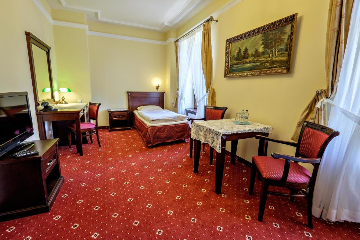 Pokój jednoosobowy. A classically decorated room with elegant, wooden furniture and cherry-red, carpeted floor. There is a view of the garden as well as an LCD TV with cable channels. Pokój Jednoosobowy - 1 osobowy. Powierzchnia pokoju ok.: 18 mkw. ;