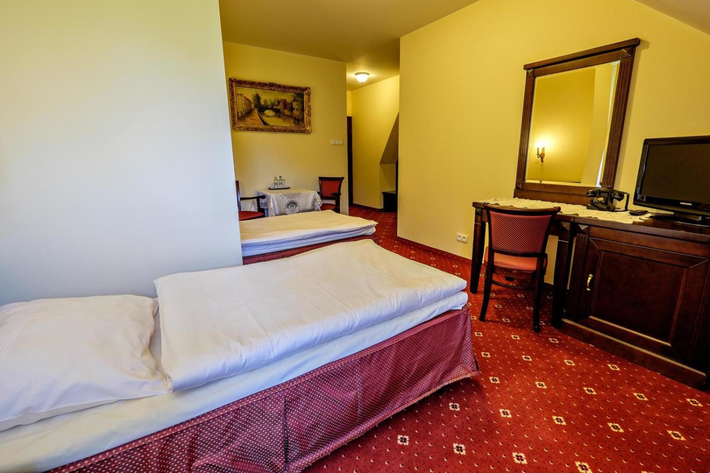 Pokój Dwuosobowy typu Superior. A classically decorated room with elegant, wooden furniture and cherry-red, carpeted floor. There is a view of the garden as well as an LCD TV with cable channels. Pokój Dwuosobowy z 1 lub 2 łóżkami - 2 osobowy. Powierzchnia pokoju ok.: 30 mkw. ;