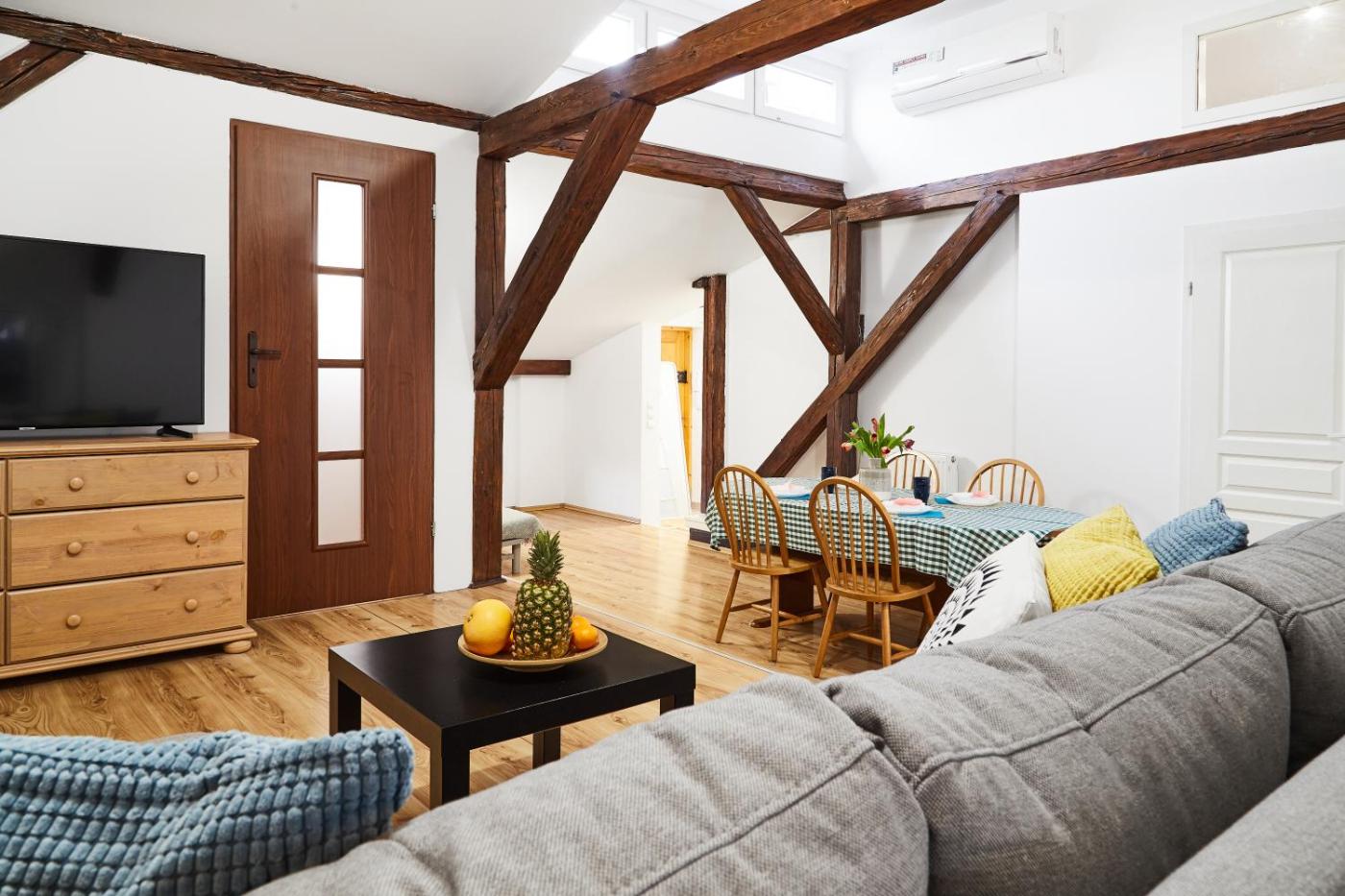 Loft. This spacious apartment is comprised of 1 living room, 3 separate bedrooms and 1 bathroom with a bath or a shower and a hairdryer. In the well-equipped kitchen, guests will find a stovetop, a refrigerator, kitchenware and an oven. This apartment is air-conditioned and features a seating area with a flat-screen TV, a washing machine, a tea and coffee maker, a dining area, as well as a wardrobe. The unit offers 4 beds. Apartament - 7 osobowy. Powierzchnia pokoju ok.: 85 mkw. ;